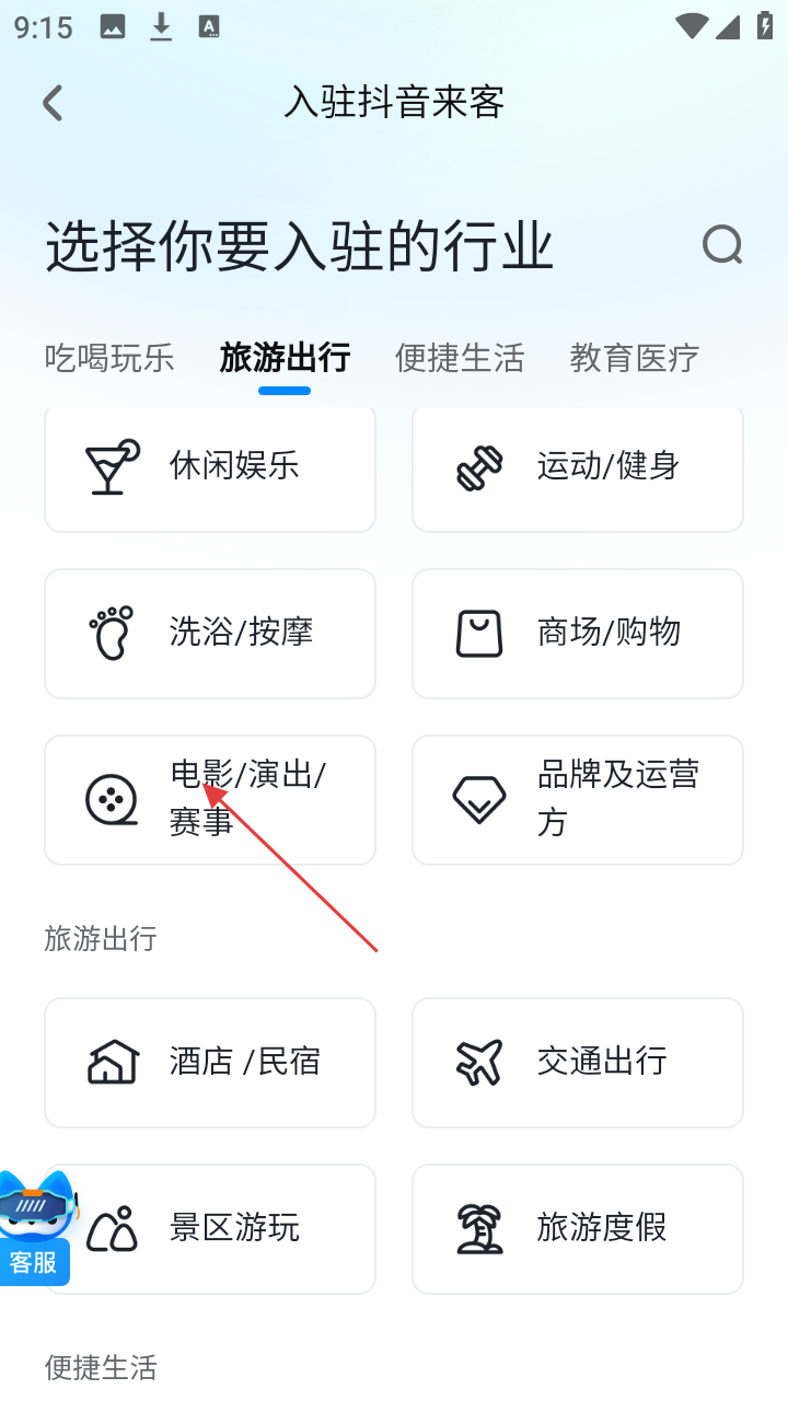 2、在选择入驻行业页面,点击【电影/演出/赛事】选项,进入门店选择页面。