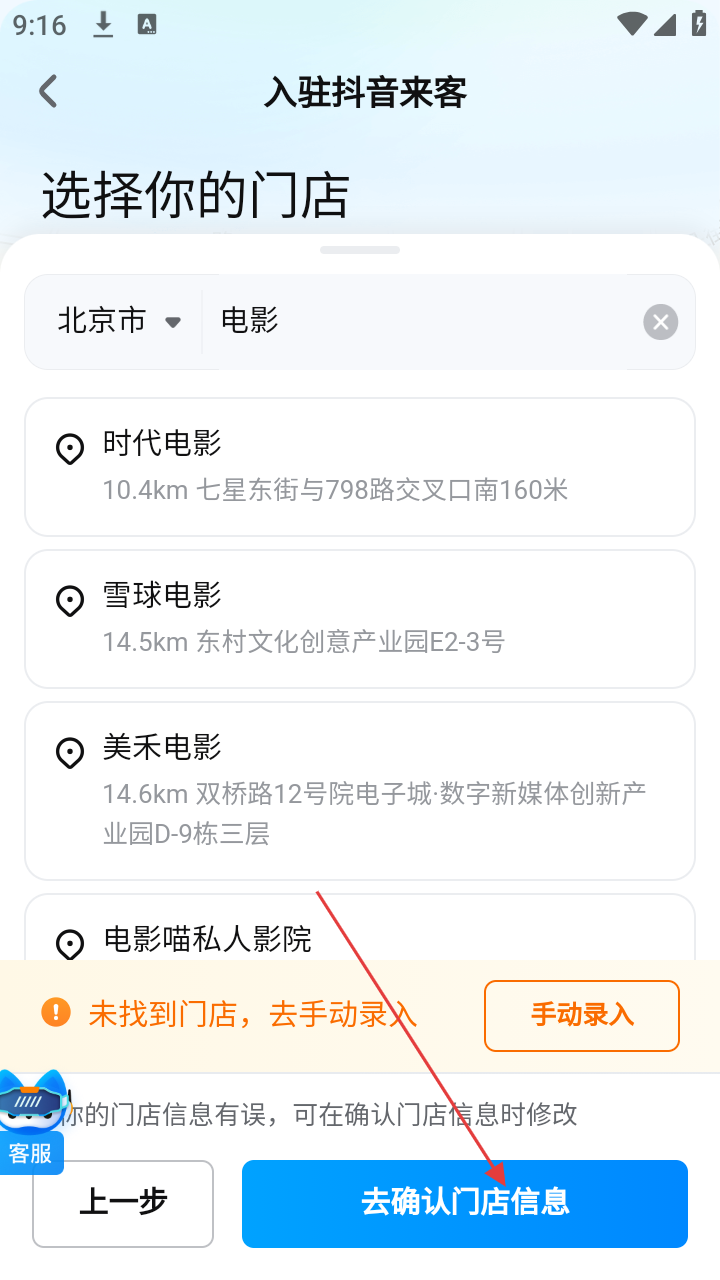 3、在门店选择页面,选好门店后,点击【去确认门店信息】按钮,进入门店信息确认页面。