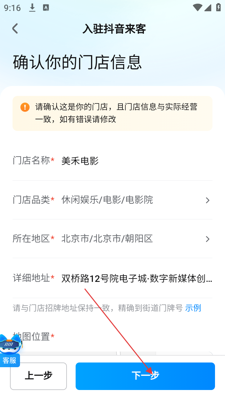 4、在门店信息确认页面,核对门店名称、品类、地区、地址等信息无误后,点击【下一步】按钮。