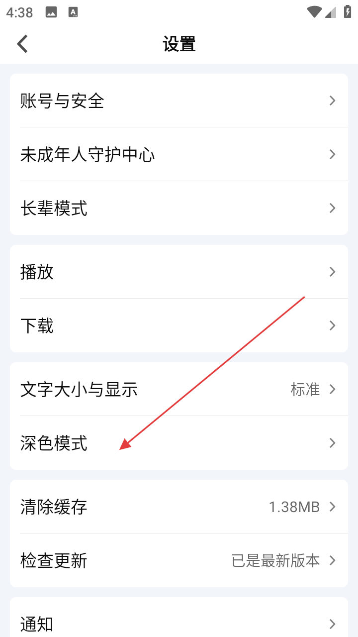 3、在设置页面,有账号与安全、未成年人守护中心等选项,点击【深色模式】。