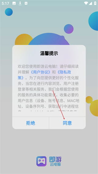 1、首次打开即游云电脑应用,阅读《用户协议》与《隐私政策》后,点击“同意”按钮,进入登录选择页面。