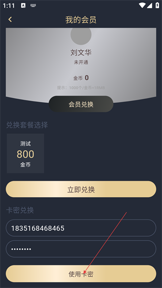 4、在卡密兑换处输入充值卡号和卡密后,点击【使用卡密】,即可完成会员开通或金币充值,获取会员权益。