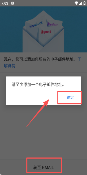 3、至少添加一个地址后点“确定”,再按“转至GMAIL”即可进入统一收件箱。
