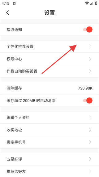 3、在设置页面,可进行【接收通知】【个性化推荐设置】【权限中心】等设置,根据需求调整功能选项。