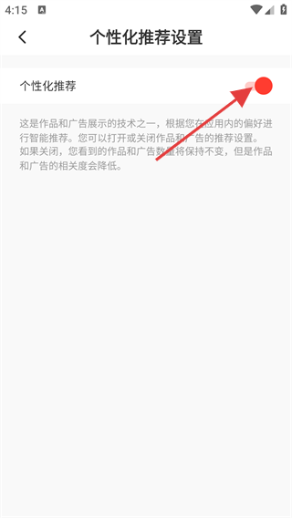 4、进入【个性化推荐设置】页面,可开启或关闭【个性化推荐】功能,调整作品和广告的推荐相关度。