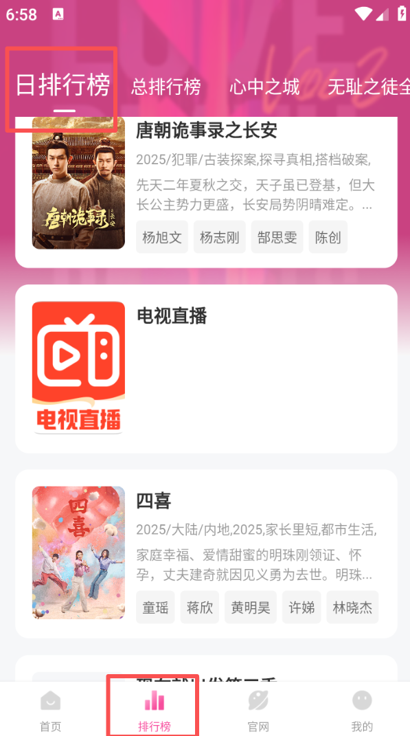 2、切换到排行榜页面,在 “日排行榜” 分类下,可查看当前热门的影视内容,了解作品的基本信息。