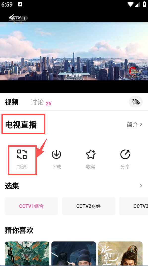 3、打开电视直播播放页,点击 “换源” 按钮可切换不同播放线路,还能进行收藏、分享等操作。