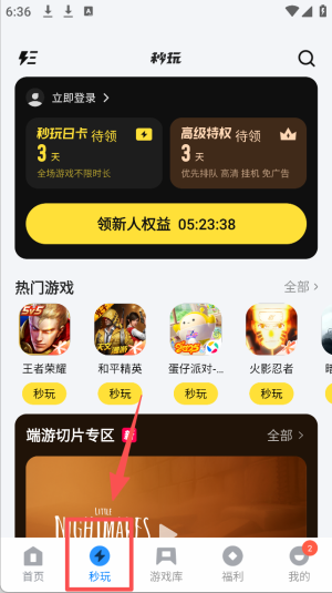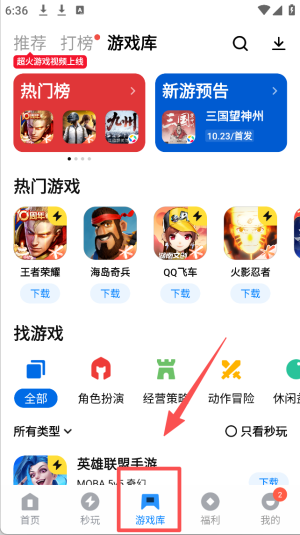 2、在秒玩页面,点击“热门游戏”查看当前流行游戏并下载。