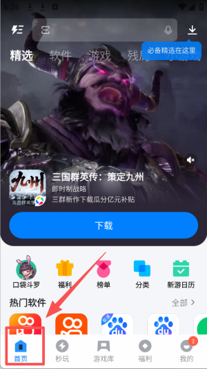 1、在首页点击“精选软件”或“热门游戏”图标,浏览推荐内容。