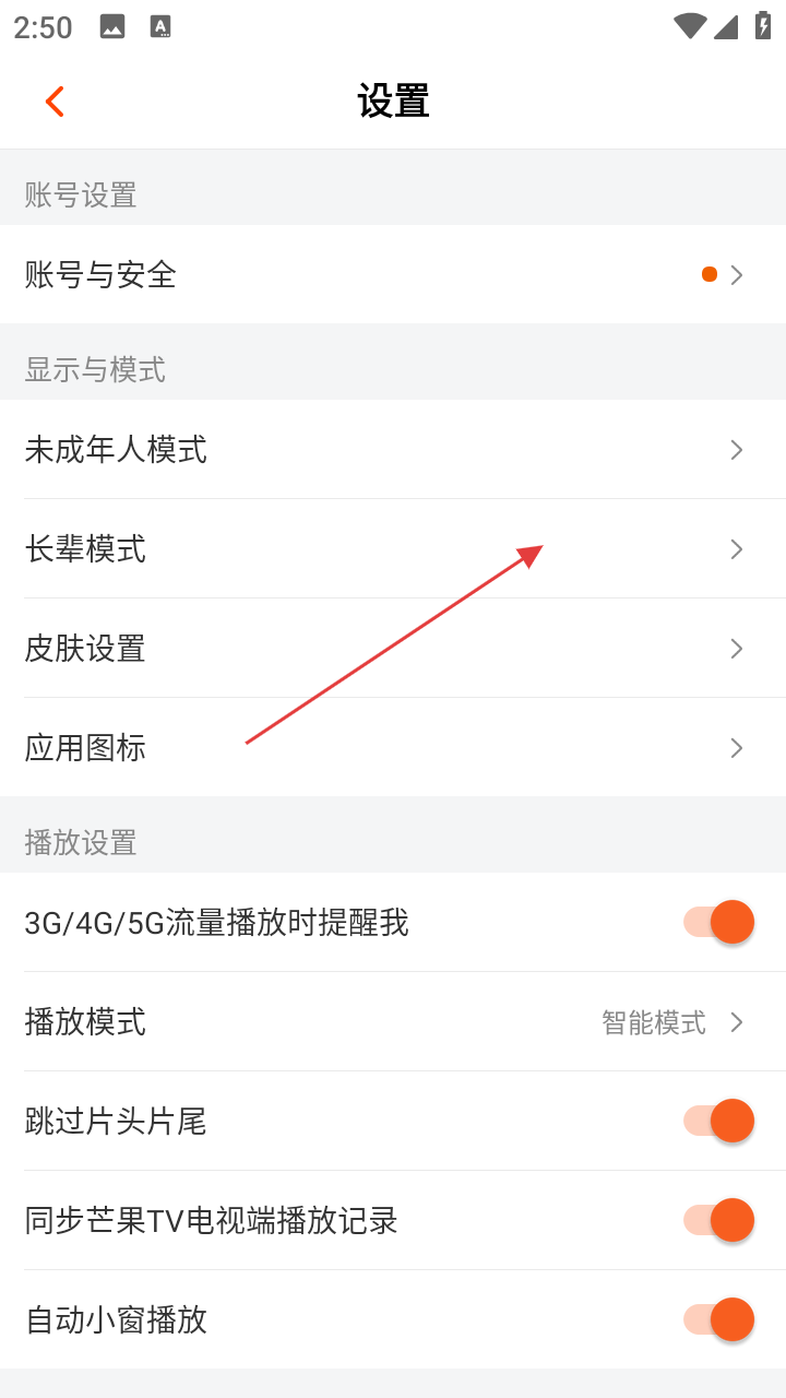 3、进入设置界面,有【账号与安全】【未成年人模式】等选项,点击【长辈模式】可进入相关设置页。