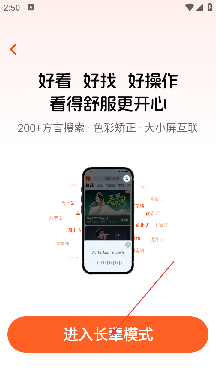 4、进入长辈模式页面,介绍了方言搜索等功能,点击【进入长辈模式】按钮即可开启该模式,开启模式后即可开启方言搜索功能。