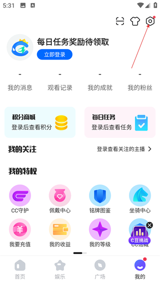 1、进入【CC直播】后,若需管理个性化服务设置,可点击右下角“我的”进入个人页面。