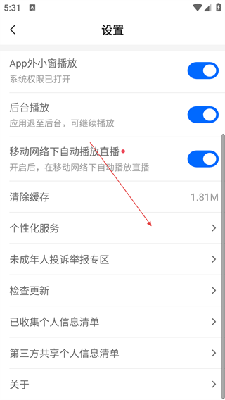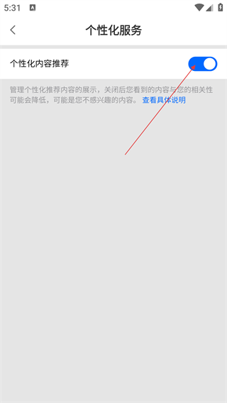 4、在个性化服务页面,可点击“个性化内容推荐”右侧开关,开启或关闭个性化内容推荐功能。