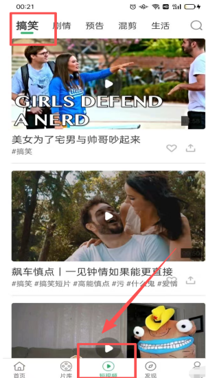 3、切到搞笑栏目,点美女高能短片一键连播刷不停。