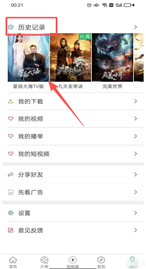 4、打开历史记录把星辰大海加下载,再分享好友同看。