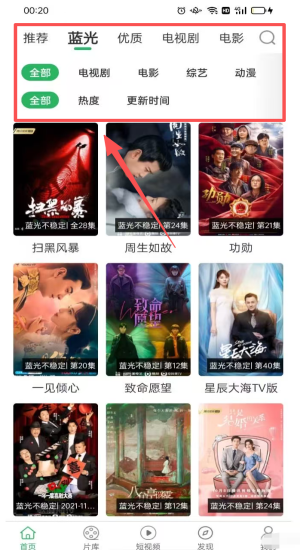 1、在推荐页点开“蓝光”标签,选扫黑风暴等热剧直接播放。