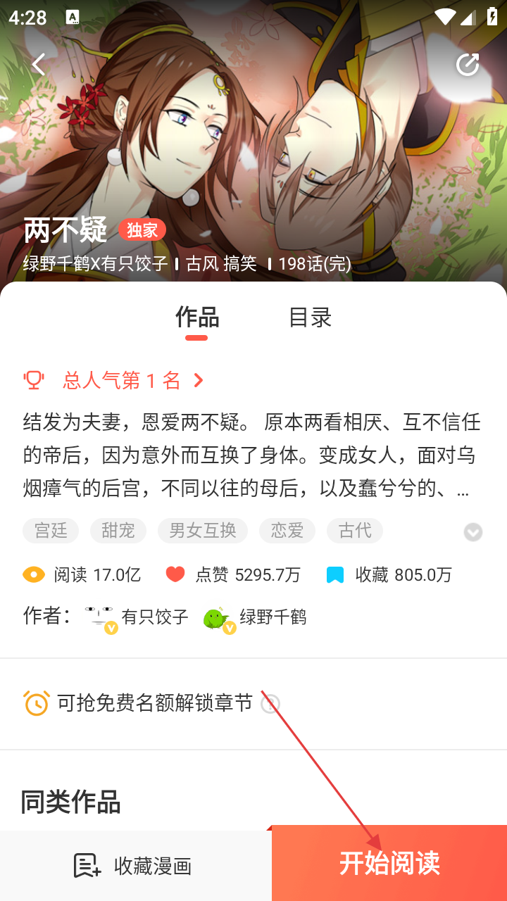 3、进入【两不疑】详情页后,点击【开始阅读】按钮。