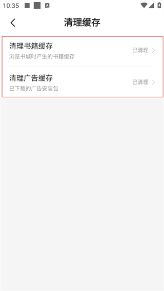 4、在清理缓存界面,可分别点击【清理书籍缓存】和【清理广告缓存】,完成对应缓存的清理操作。