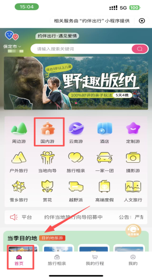 1、打开小程序首页点“云南游”,挑选5天4晚版纳定制行程。