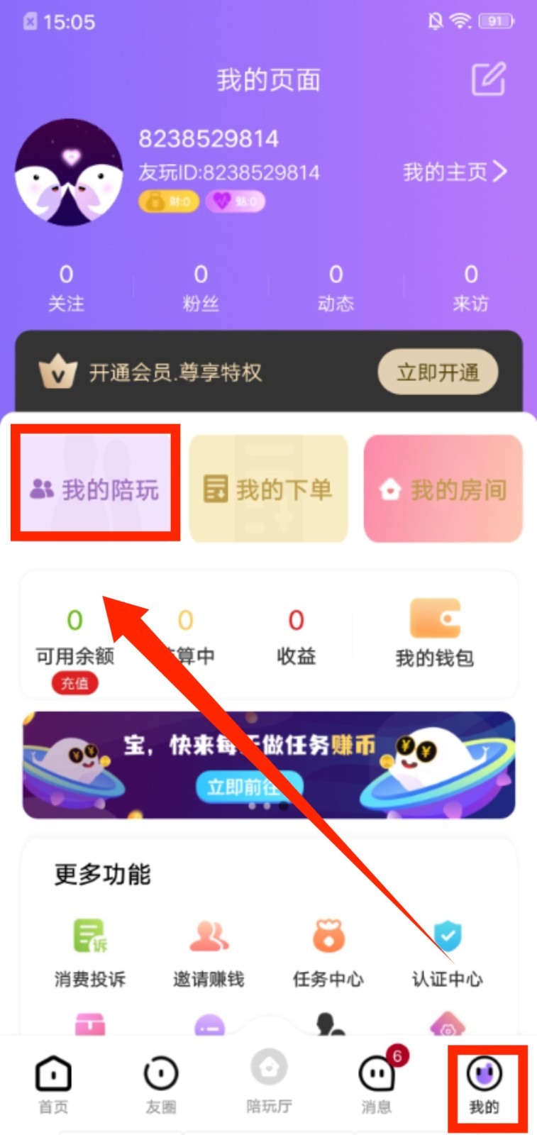 1、进入 “我的” 页面,点击 “我的陪玩” 选项,进入对应的功能管理界面。