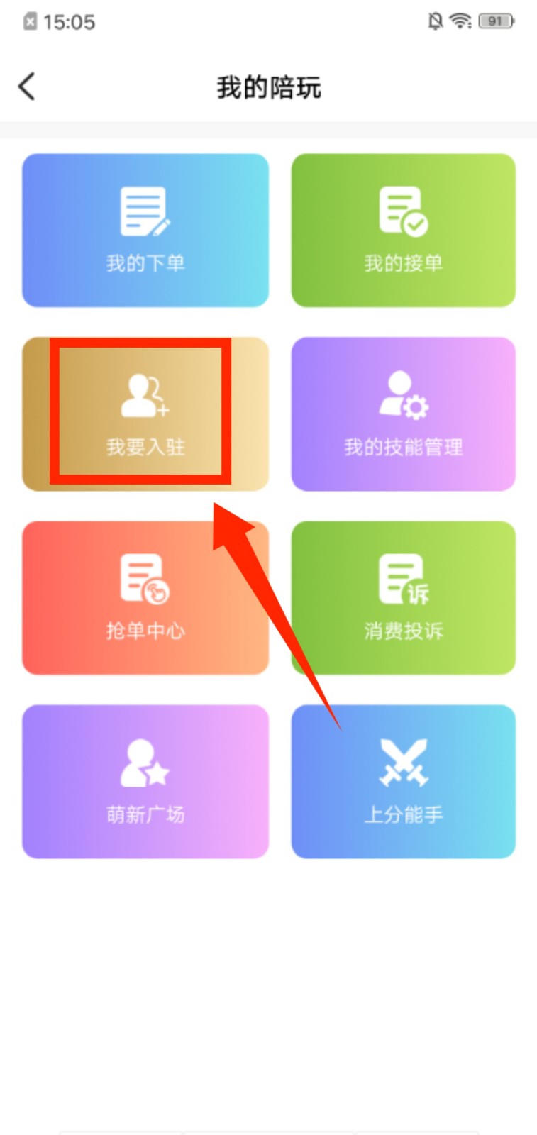 2、在我的陪玩页面,选择 “我要入驻”,进入入驻相关的操作流程。