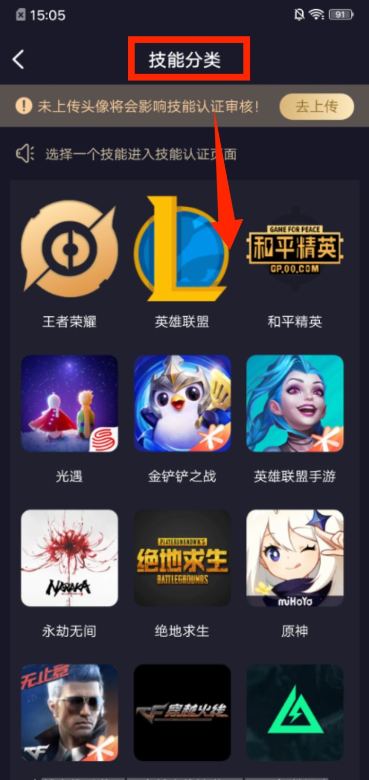 3、进入技能分类页面,挑选对应的游戏技能,进入该技能的认证准备环节。