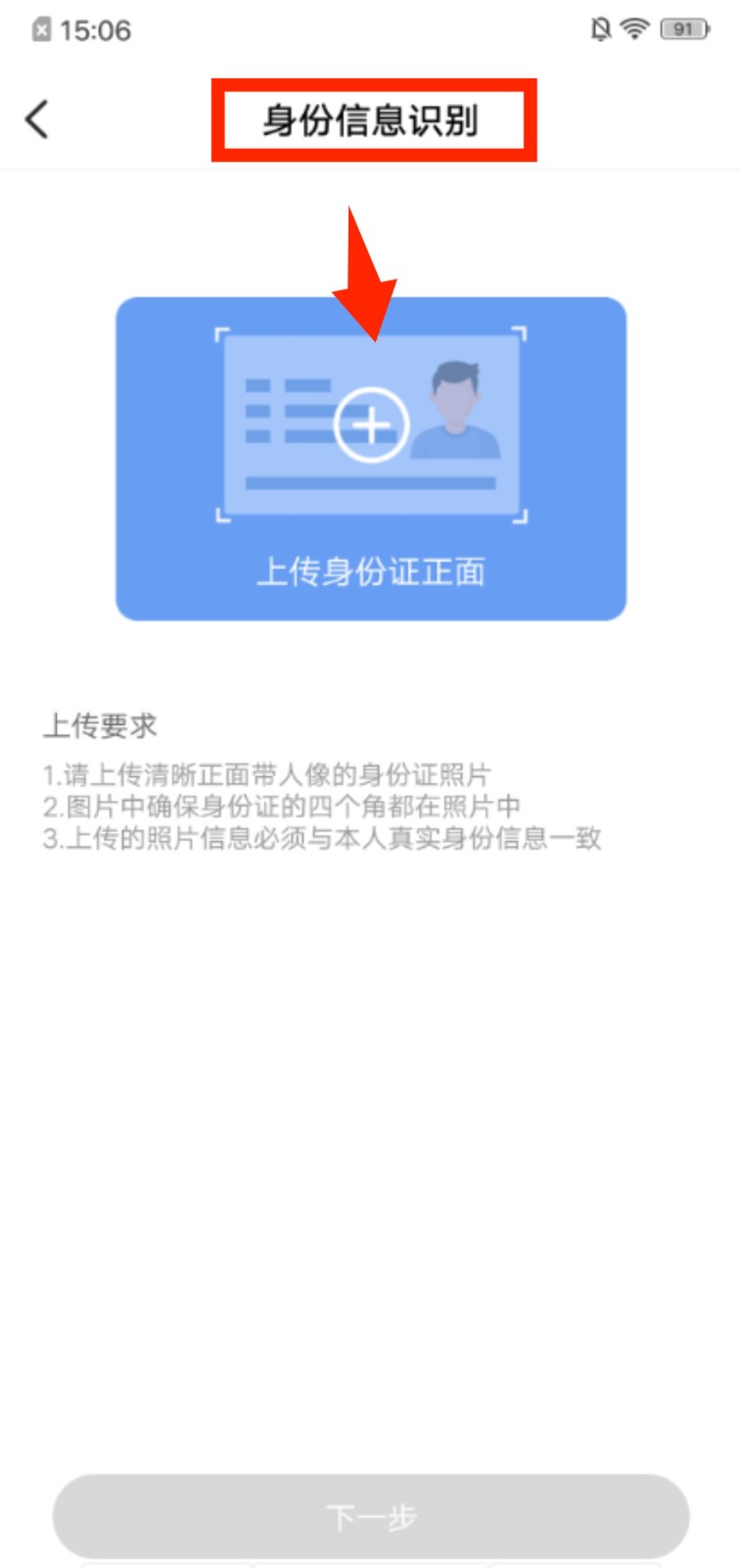 4、进入身份信息识别页面,按要求上传身份证正面照片,完成身份信息的提交步骤。