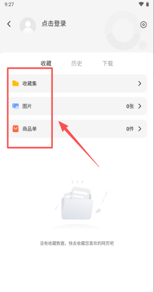 4、点击登录后进入收藏夹,随时保存历史下载商品与网页方便回看。