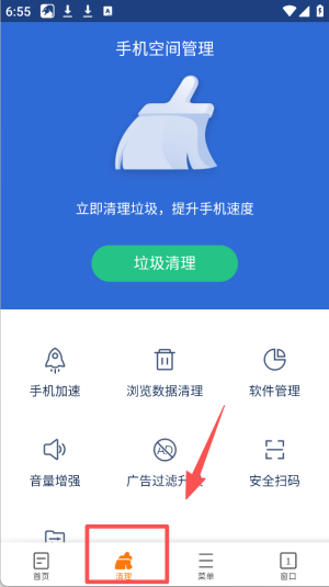 2、在清理工具页面,点击“垃圾清理”按钮,优化手机性能。