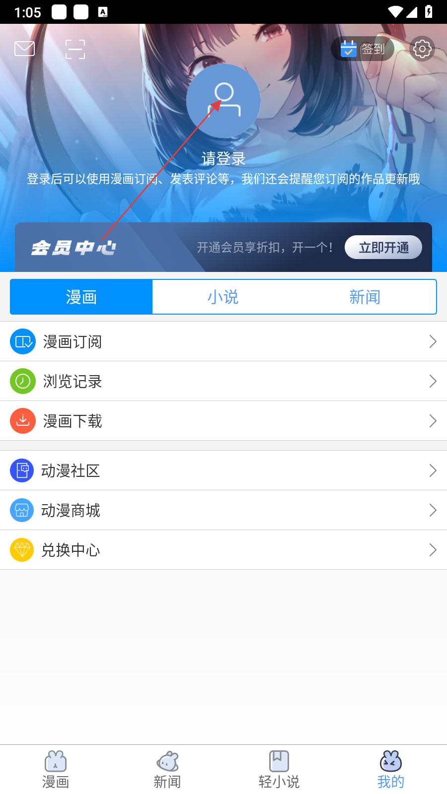 2、在【我的】页面,点击【请登录】按钮,即可进入登录界面,以便使用漫画订阅等功能。