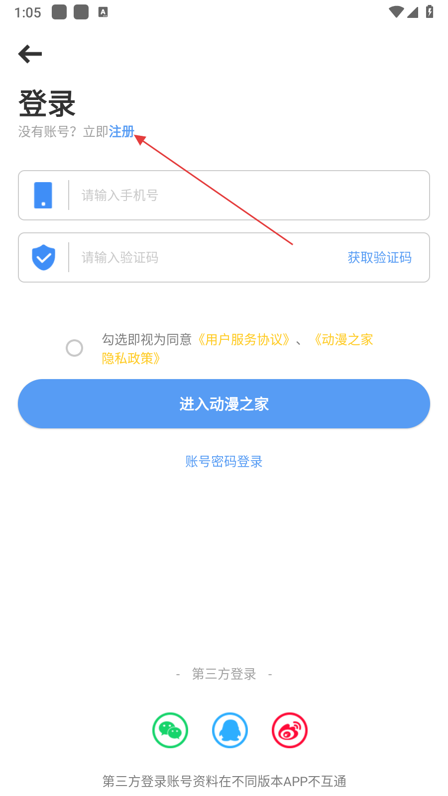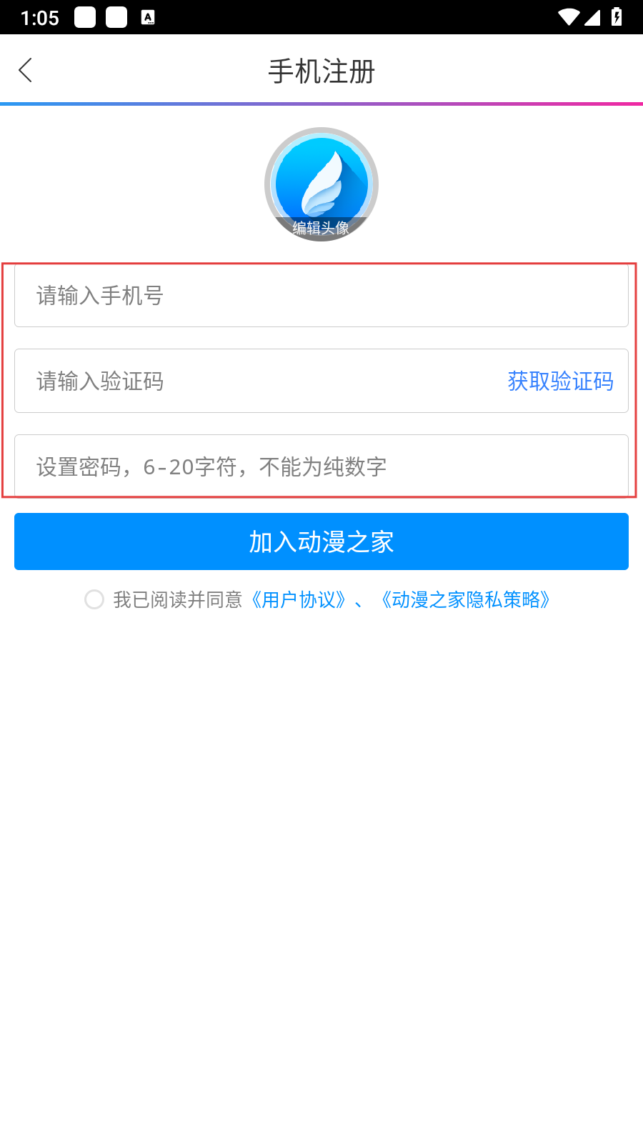4、在手机注册页面,依次输入手机号、验证码,设置符合要求的密码,勾选协议后点击【加入动漫之家】,即可完成注册。