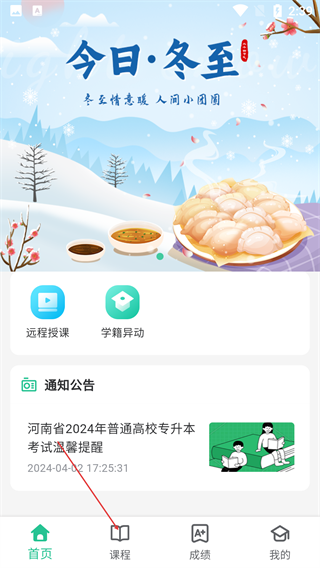 2、完成协议确认后,进入App首页,可查看功能入口及通知公告,点击底部导航栏的【课程】选项,进入课程相关流程。