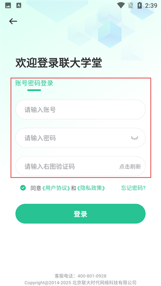 4、若需登录账号,进入“欢迎登录联大学堂”界面,选择“账号密码登录”方式,依次填写账号、密码、右侧验证码,点击【登录】完成验证。