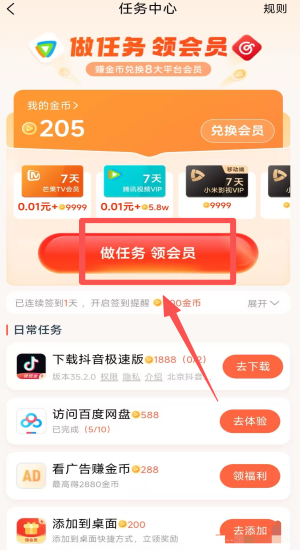 1、在任务中心点击“做任务 领会员”按钮,通过完成任务赚取会员。