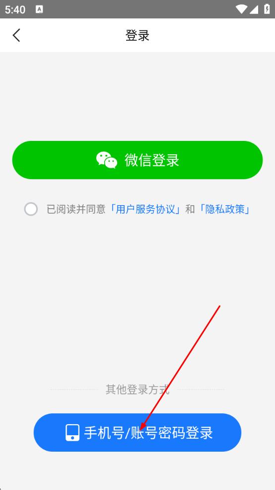 3、在登录方式选择页点击【手机号/账号密码登录】选项,进入手机号登录页面。