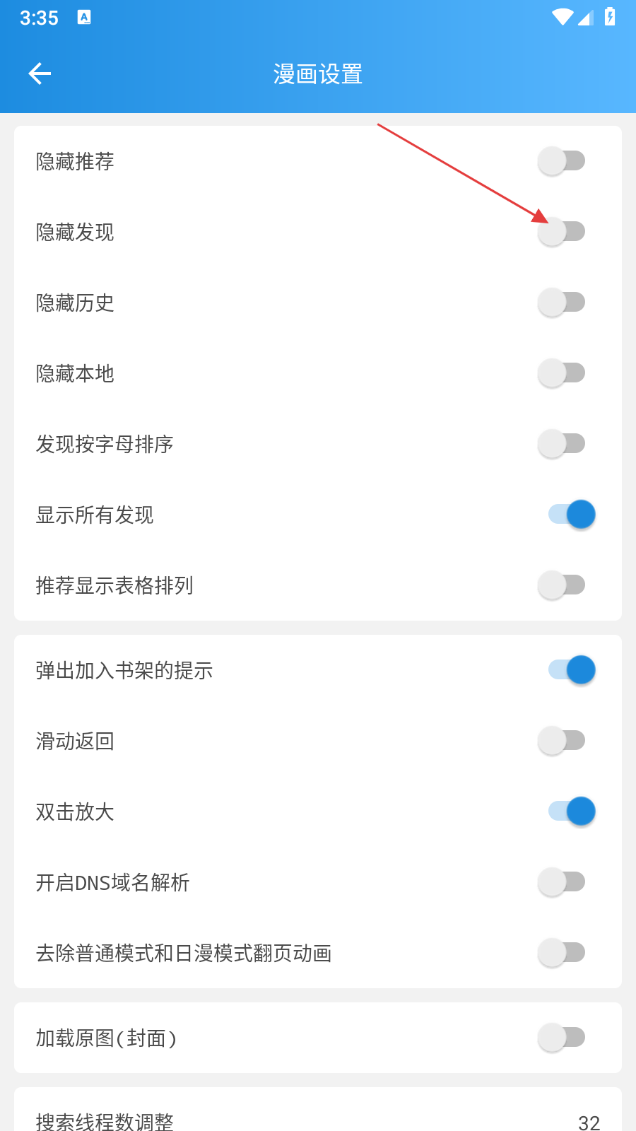 4、在漫画设置页面找到【隐藏发现】选项,开启该功能,可隐藏APP内的发现板块内容,让界面更简洁。