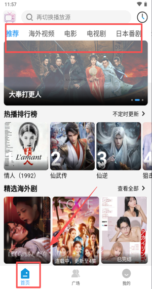 2、首页搜索想看的影片,如遇卡顿点“切换播放源”即可继续观看。