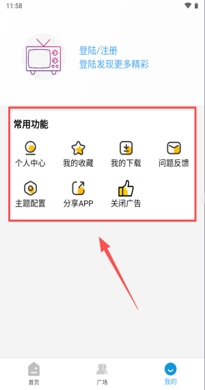 4、点“登录/注册”进个人中心,收藏下载影片并开启主题配置。