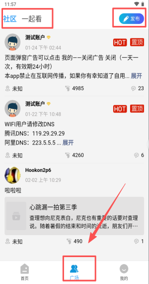 3、进入广场查看置顶帖,按提示修改DNS或点关闭广告免弹窗。