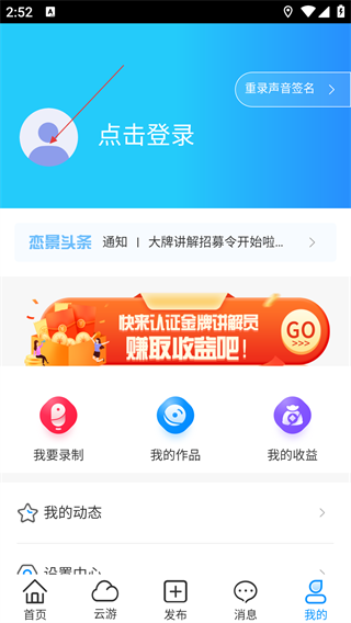 2、在个人中心页面,点击【点击登录】按钮,进入登录界面。