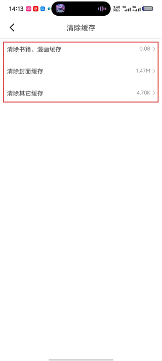 4、在清除缓存界面,可选择清理“书籍/漫画缓存”“封面缓存”“其它缓存”,点击对应选项即可释放应用占用的存储空间。