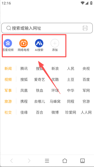 1、首页搜索框输入关键词,即可秒开百度视频、新浪等热门站点。