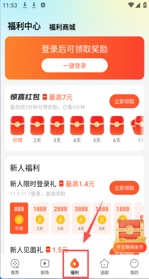 4、进福利中心一键登录领7元红包,看满3分钟再得金币换现金。