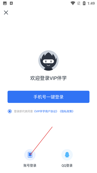 3、在登录页,勾选“登录即代表同意《VIP伴学用户协议》《隐私政策》”后,选择“账号登录”方式。