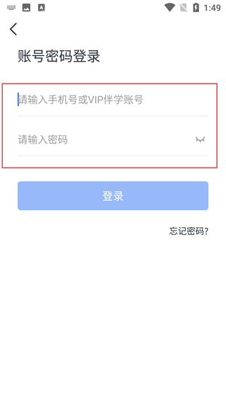 4、在“账号密码登录”界面,依次填写手机号或VIP伴学账号、对应的密码,点击【登录】完成操作;若忘记密码,可点击“忘记密码?”找回。