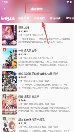 3、查看本月榜单,挑选罪恶之渊等热门番剧并加入追番列表。