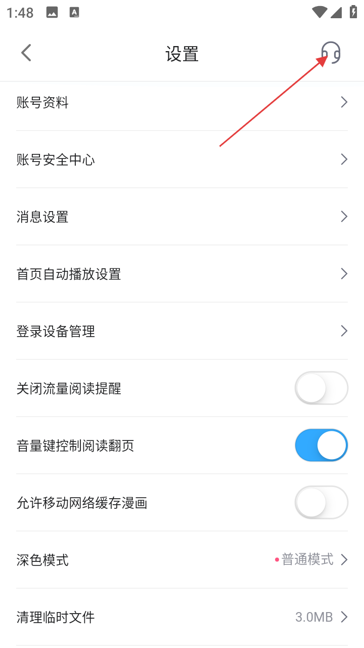 3、在设置页面,点击右上角联系客服图标,进入帮助中心页面。