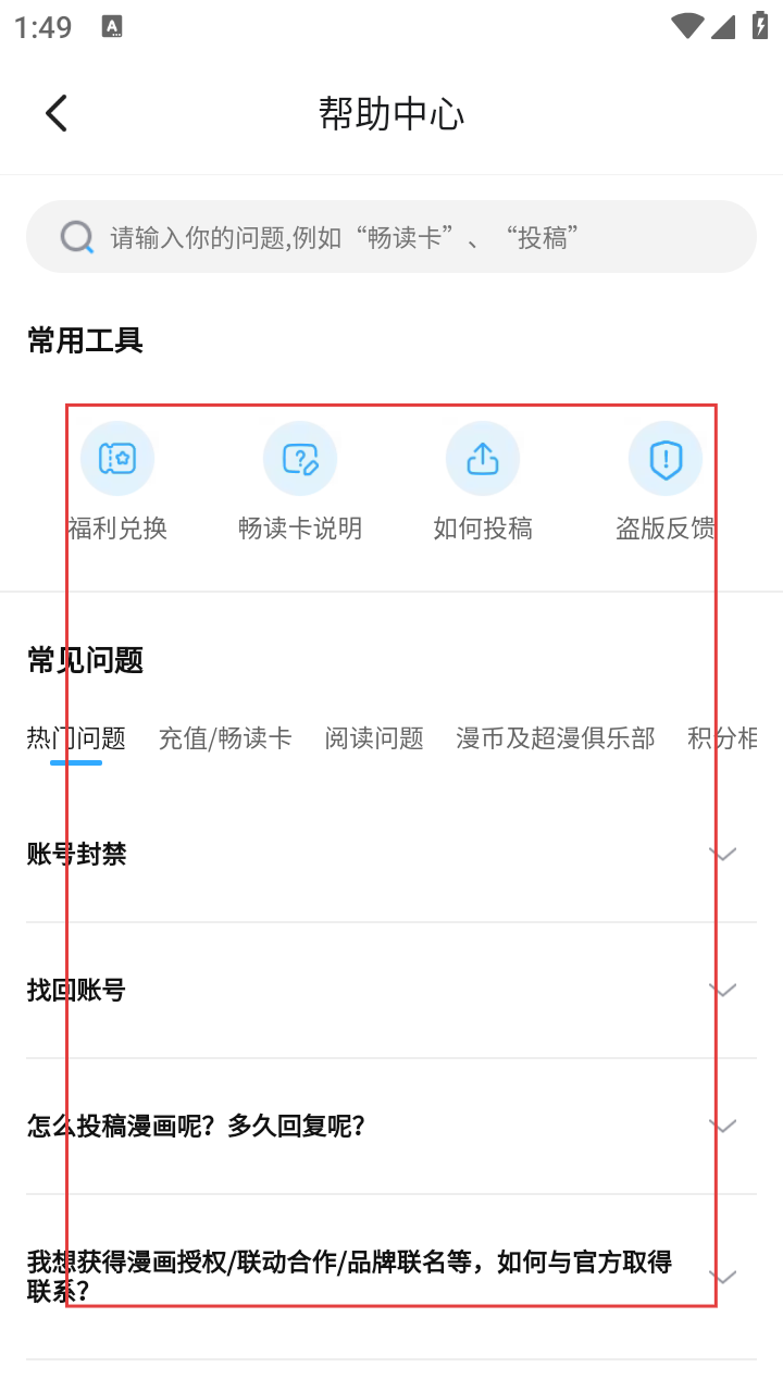 4、在帮助中心页面,可使用搜索框,也能在常用工具和常见问题分类里查找所需帮助内容。
