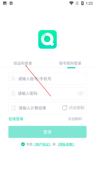 2、在登录页,可选择【账号密码登录】或【验证码登录】两种方式,点击验证码登录。