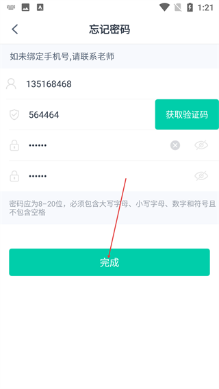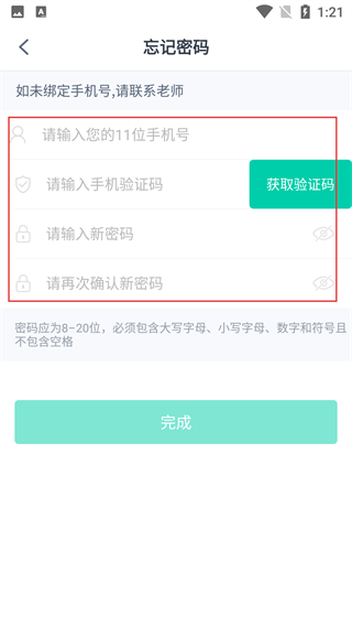 4、填写完所有信息后,点击【完成】,完成密码重置,可返回登录页用新密码登录。